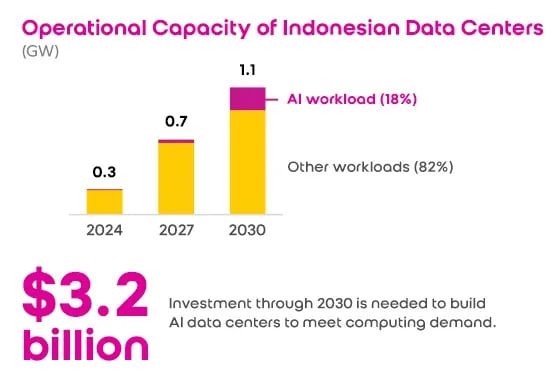 Indonesia’s journey toward AI sovereignty begins with strengthening its digital backbone. According to Indosat Ooredoo Hutchison’s Empowering Indonesia Report (IOH, 2024), the country’s data centers account for less than 1% of global capacity, prompting an estimated USD 3.2 billion investment need by 2030. Operational capacity is projected to rise from 0.3 GW in 2024 to 1.1 GW by 2030, with 18% of the workload dedicated to AI. This growth illustrates Indonesia’s ambition to become self-sufficient in computing power and data management. For the local market, these investments signal a massive opportunity for cloud providers, infrastructure developers, and renewable-energy partnerships to support AI-ready data ecosystems.