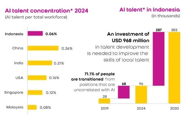 While infrastructure advances rapidly, Indonesia faces a critical talent challenge. Only 0.06% of Indonesia’s workforce currently works in AI-related roles—far behind China (0.26%), India (0.21%), and Singapore (0.12%). To bridge this gap, an investment of USD 968 million in AI talent development is projected through 2030, aiming to grow local AI professionals from 287,000 in 2024 to 383,000. Encouragingly, over 71% of new AI workers transition from unrelated fields, showing a strong reskilling culture. For Indonesia’s digital economy, this highlights the need to scale up education, industry training, and public-private collaboration to ensure that digital transformation is not just built, but powered by local expertise.