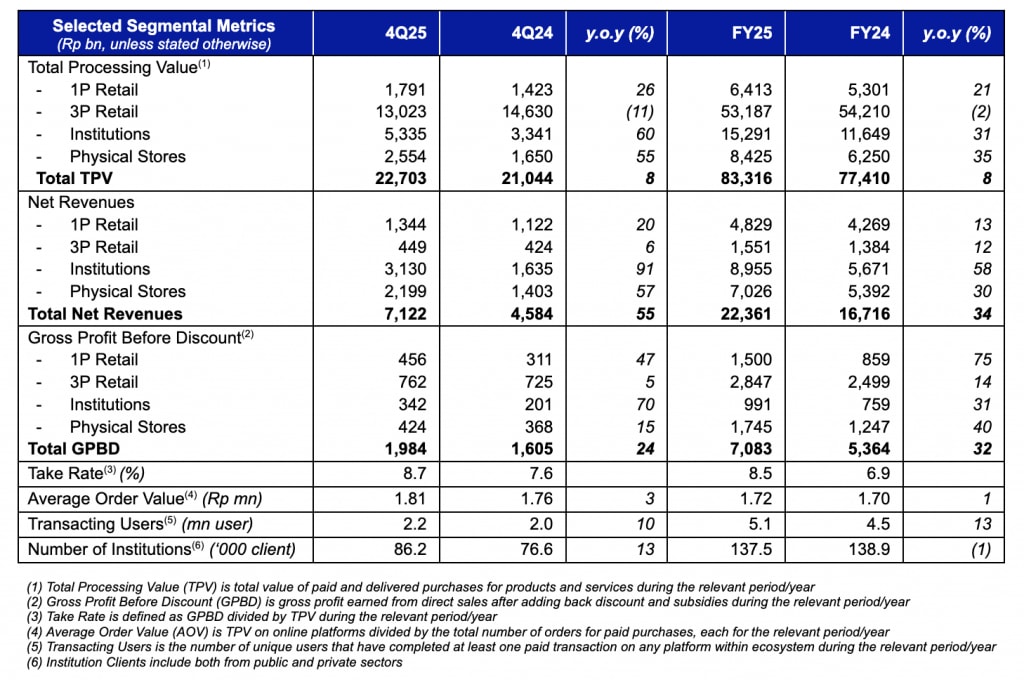 Blibli shows omnichannel can actually work. PT Global Digital Niaga (Blibli) posted full-year 2025 net revenues of Rp22.4 trillion — a 34% year-on-year jump, while simultaneously improving its EBITDA trajectory by 60 basis points, proving that scale and efficiency can move together. The company’s take rate expanded from 6.9% to 8.5%, driven by a strategic push into higher-margin categories like smartphones and home appliances, now backed by 265 consumer electronics stores and 57 Ranch Market outlets. The full rollout of Unified Membership and Blibli Tiket Rewards across Blibli, tiket.com, Ranch Market, and Dekoruma created the kind of cross-platform stickiness that most e-commerce players only dream about. With management targeting 15–20% net revenue growth in 2026, the integrated omnichannel playbook is looking less like a theory and more like a proven model.
