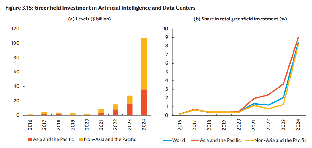 Digital FDI is the bright spot in an otherwise cautious investment landscape. Overall FDI into Asia and the Pacific slipped 2% to $614 billion in 2024, with East Asia down 15%, yet digital investment told a completely different story, growing 24–25% in the same period and now representing 35% of total FDI inflows to the region. AI infrastructure, data centers, and fintech collectively absorbed roughly three-quarters of all digital FDI, with Southeast Asia capturing 26% of regional digital flows. The ADB frames this as a structural opportunity: the global AI boom is creating a durable investment tailwind that policy can either capture or squander through poor data governance and skills gaps.