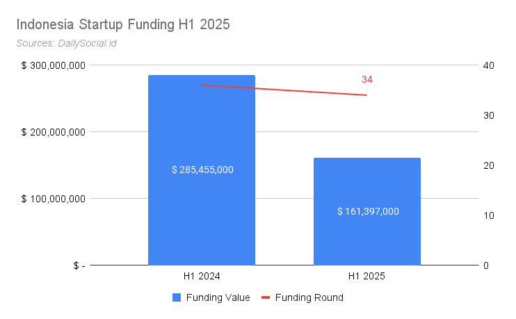 Indonesia's startup investment landscape remains sluggish in the first half of 2025. According to DailySocial.id, total funding dropped 43.5% YoY to US$161.3 million across 34 disclosed deals, down from US$285.4 million from 36 deals in H1 2024. This reflects broader challenges: a cautious global macroeconomic climate, stricter investor due diligence, and pressure on startups to demonstrate clearer profitability and governance.