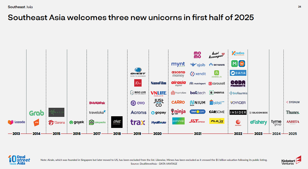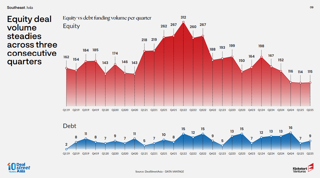 Summarizing the reports of DealStreetAsia and Kickstart Ventures, Southeast Asia’s funding cycle hit a six-year trough in H1’25 at US$1.85B across 229 deals, but momentum improved in Q2 as value more than doubled (US$1.28B vs US$0.57B in Q1)—a sign that capital is concentrating in fewer, stronger companies. Private debt also tightened to ~US$0.49B across 16 transactions, reflecting lender caution and a preference for clearer revenue visibility.