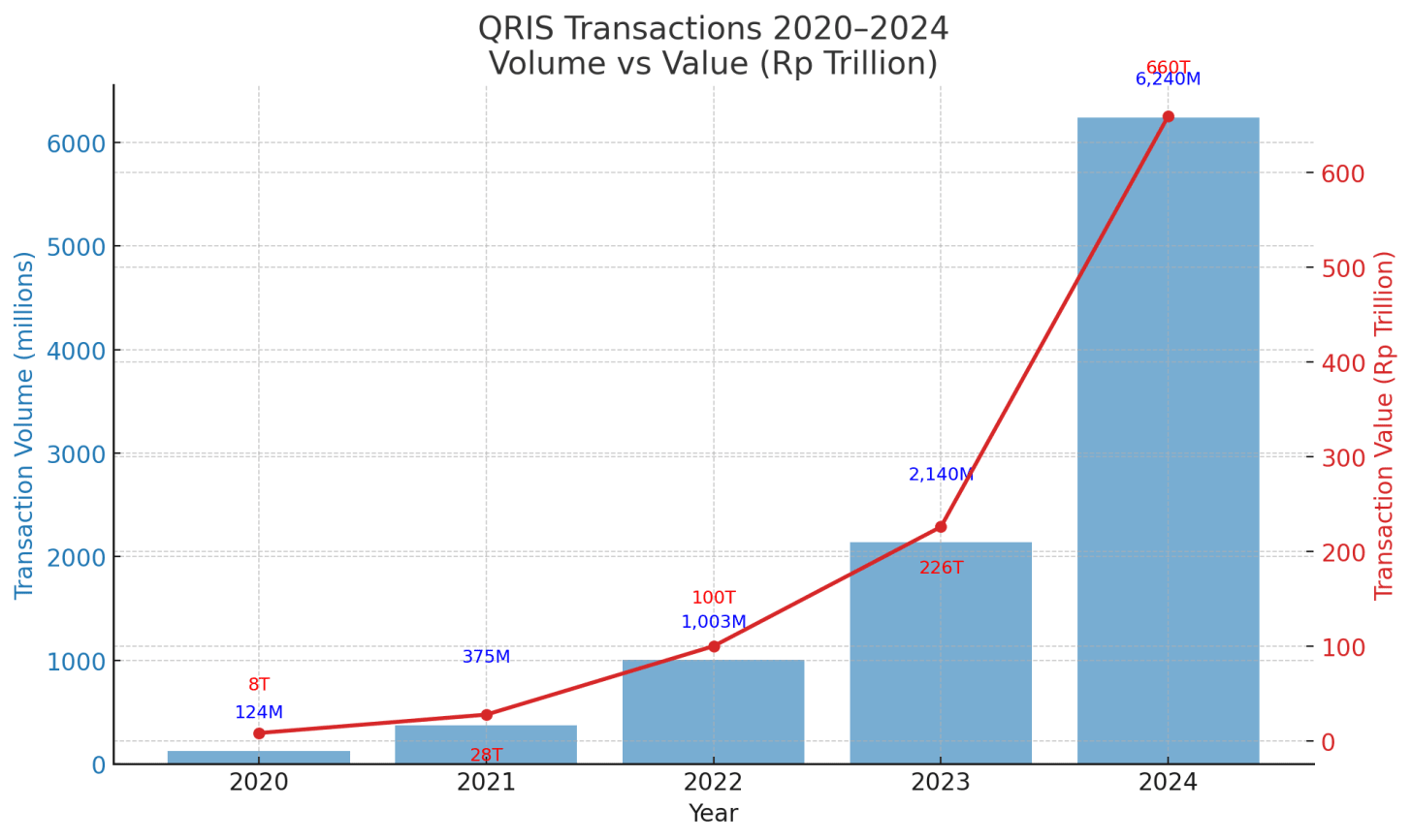 By mid-2025, QRIS had reached 57 million users and 39.3 million merchants, of which 93.16% are MSMEs. Transactions totaled 6.05 billion, with a value of Rp 579 trillion (USD ~36 billion). The volume of digital payment transactions through QRIS grew 148.50% year-on-year (YoY). The rapid uptake underscores how QRIS has become the backbone of Indonesia’s digital payment infrastructure, driving MSME digitalization at scale and cementing its role as a national financial inclusion tool. Read more